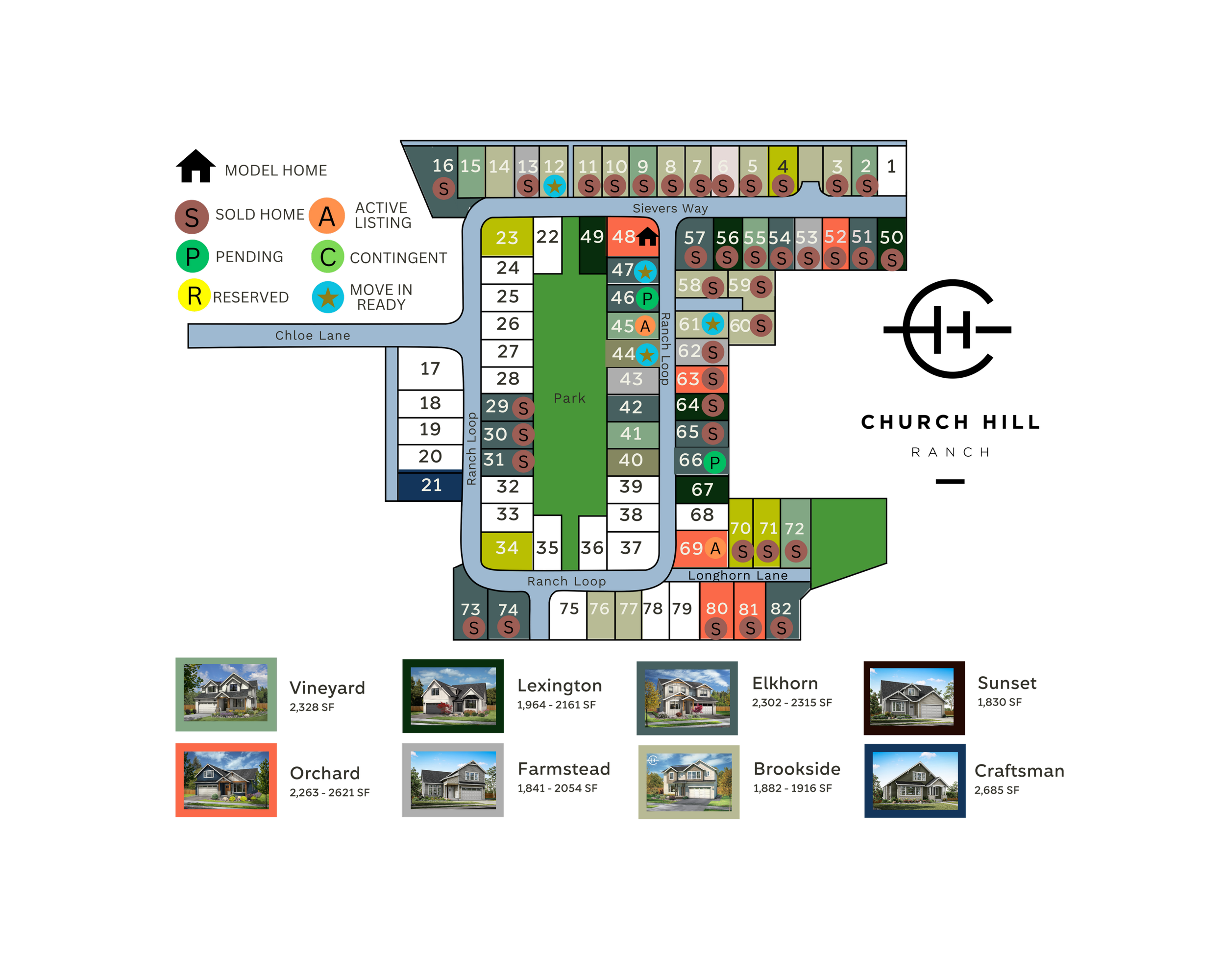 The Church Hill Ranch neighborhood has 82 beautifully designed homes featuring eight incredible models to choose from, each model with two options. We keep this map updated on what houses are currently available. If you’re interested in a particular location or model, we’re happy to provide all the details you need.